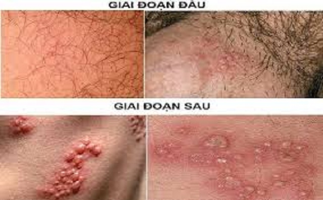 - Sau vài ngày sẽ thấy xuất hiện các chấm đỏ, rồi phát triển thành các mụn nước màu vàng và ngả trắng. Xét về số lượng và kích thước sẽ thay đổi, từ 1 tới 2 mụn nước nhỏ nó có thể lan ra rộng hơn và còn mọc thành từng chùm giống như chùm nho,… Sau đó các mụn nước này sẽ vỡ ra để lại các vết lở loét rồi khô đi từ từ và đóng vảy. Cuối cùng thương tổn sẽ lành trong vòng 5 – 15 ngày.